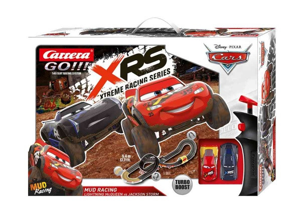 Autodráha Carrera GO !!! dlhá 5,4 m obsahuje autá Disney-Pixar Cars Blesk McQueen, Jackson Storm a ďalej potom rovinky, zákruty, looping, klopené zákruty, tunel, premostenie, napájací diel a dekorácie s tematikou Disney-Pixar Cars.