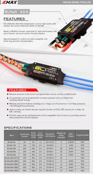 Regulátor pre striedavé (brushless) eklektromotory je vhodný pre použitie v lietadlách, vrtuľníkoch aj kvadrokoptérach. Max. trvalý prúd 60 A. Regulátor nie je kompatibilný s vysielačmi Hitec Aurora 9, Hitec Lite 4 a niektorými vysielačmi Turnigy.
