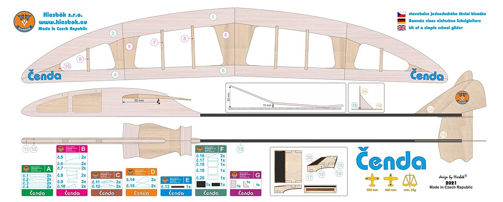 Poslať otázkuČenda je zložitejšie súťažné hádzadlo určené pre pokročilého modelára. Stavebnica neobsahuje vybrúsené lišty pre krídlo modelu, ale obsahuje prípravok, pomocou ktorého sa zlepené krídlo vybrúsi do požadovaného profilu. Deti si na ňom vyskúšajú presné brúsenie konštrukčného krídla.