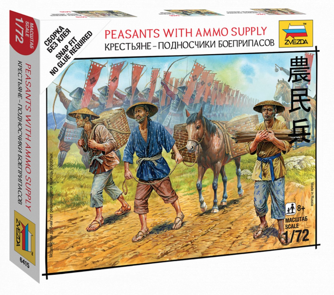 Sada plastikových figúrok zobrazujúca stredovekých roľníkoch nesúcich zásoby a šípy pre lukostrelcov. Set obsahuje plastikové výlisky pre stavbu 4 figúrok a 1 koňa.