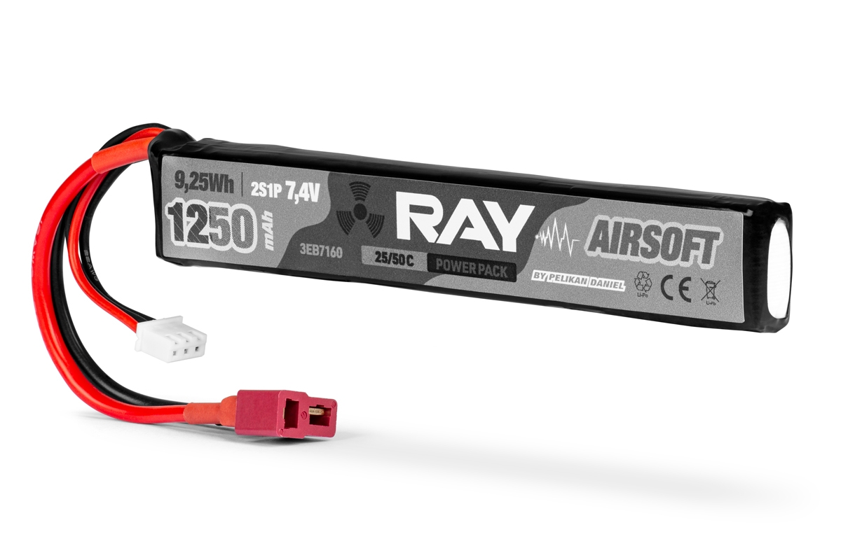 Akumulátorová LiPo sada RAY Airsoft so zvýšenou prúdovou zaťažiteľnosťou 25/50C, nabíjanie prúdom až 2C. Dvojčlánok 2S1P 7,4 V 1250 mAh, rozmery: 122×20×13 mm, hmotnosť: 64 g, konektor: Dean-T, servisný konektor: JST-XH. Akumulátor je navrhnutý pre napájanie airsoftových zbraní.