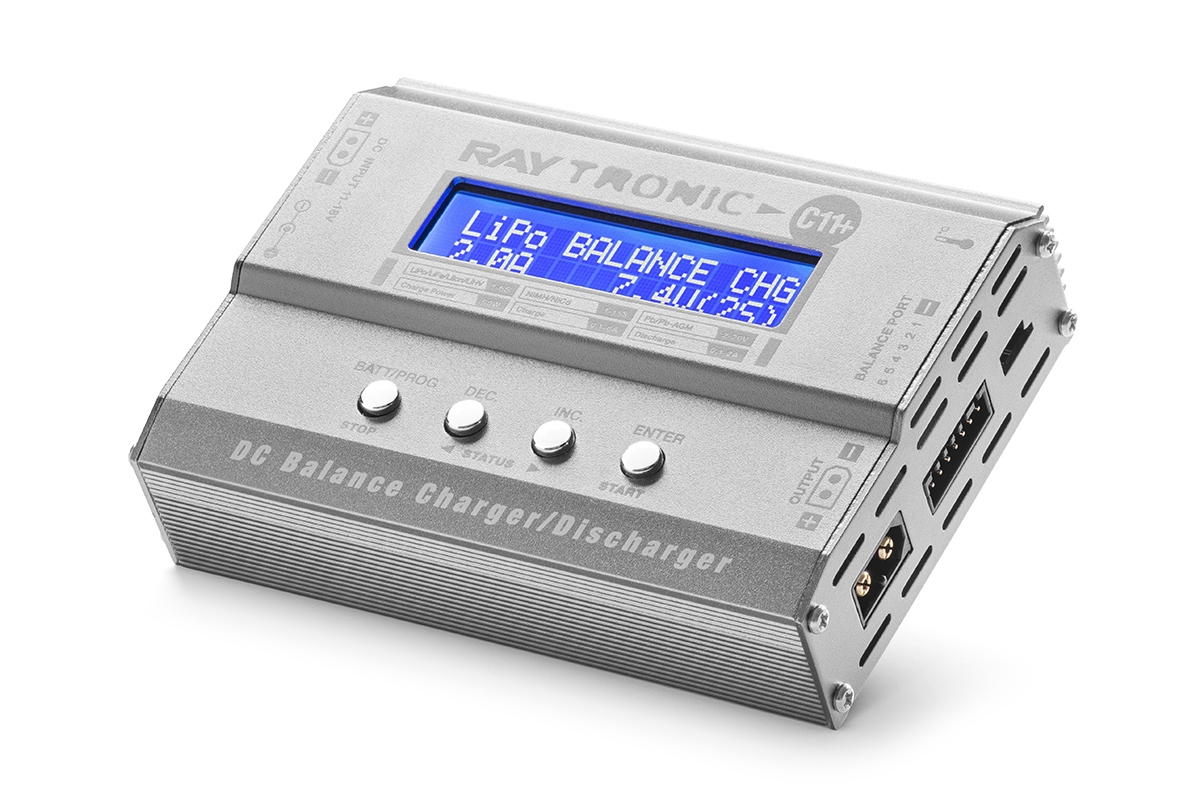 balenie obsahuje nabíjač RAYTRONIC C11+, 12V sieťový zdroj, napájací kábel 12 V so súosovými konektorom a krokosvorkami, nabíjací kábel XT60/Dean-T, nabíjací kábel XT60 (bez konektora), návod.