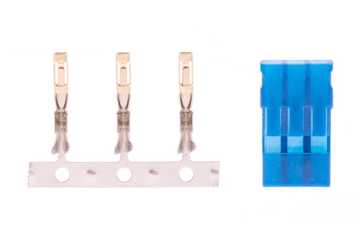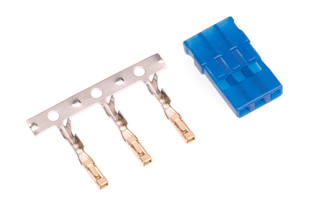 Vysoko kvalitné servokonektory JR s pozlátenými kontaktmi, plastový "domček" v modrej farbe. Prechodový odpor 3,1 mOhm, prúdové zaťaženie 3 A/24 h, 5 A/2 min, 8 A impulzné. Pre kábel max. 0,5 mm2. Balenie 100 ks. Vyrobené v Nemecku.