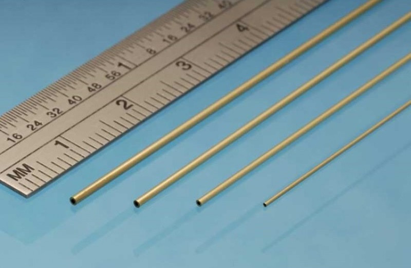 Mosazná trubička od firmy Albion Alloys s vnějším průměrem 1,0 mm, vnitřním průměrem 0,5 mm, tloušťkou stěny 0,25 mm a délkou 305 mm.