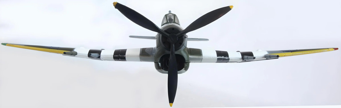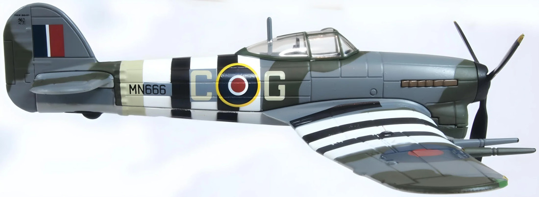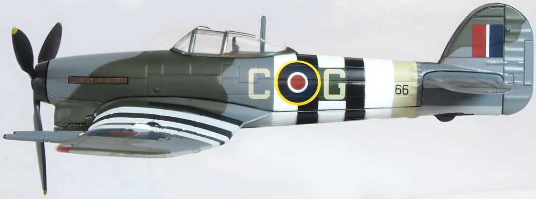Kovový zberateľský model britského druhoválečného stíhacieho lietadla Hawker Typhoon Mk.I. Model je opatrený stojanom.