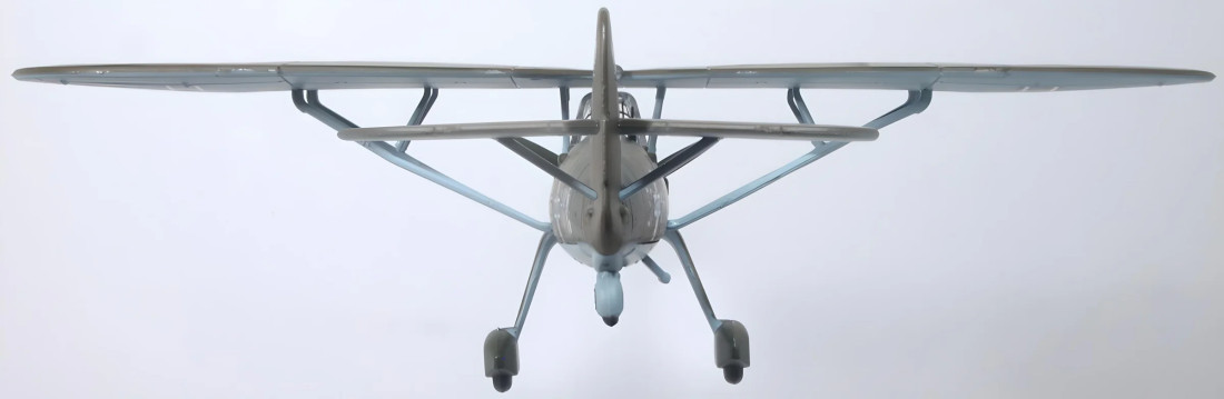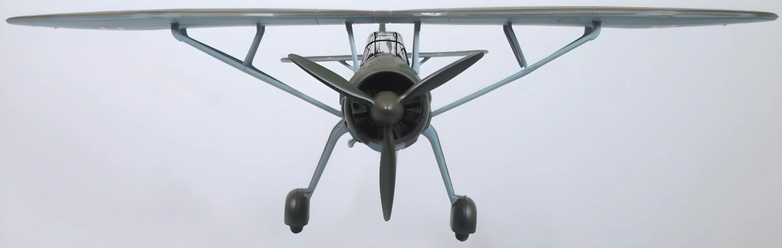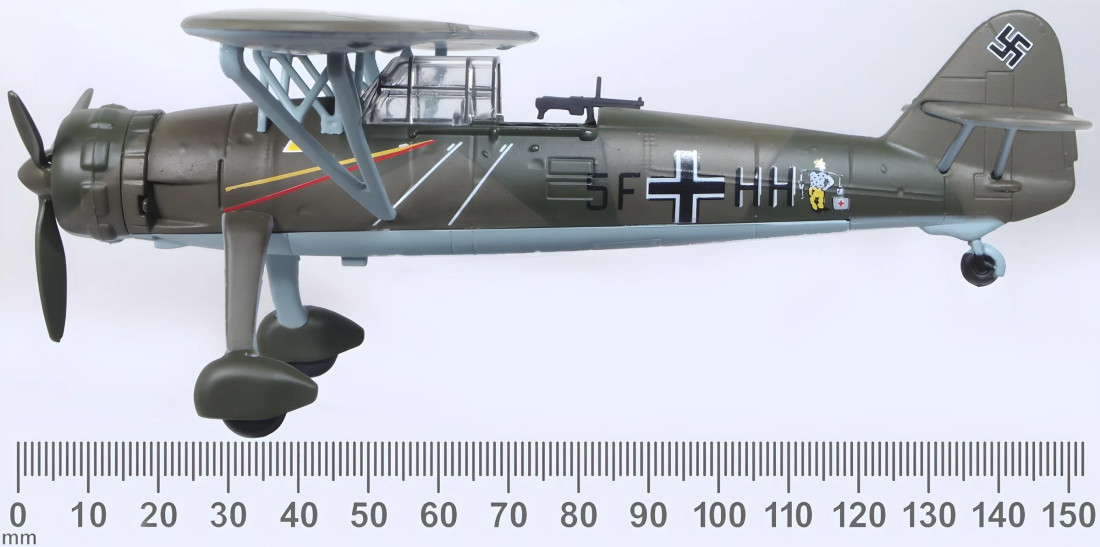 Kovový zberateľský model nemeckého druhoválečného prieskumného lietadla Henschel HS126. Model je opatrený stojanom.