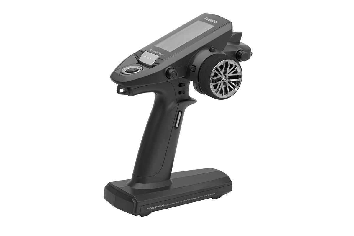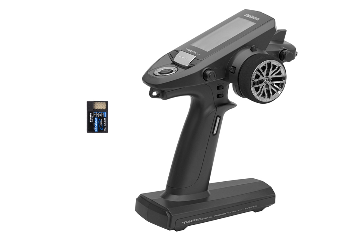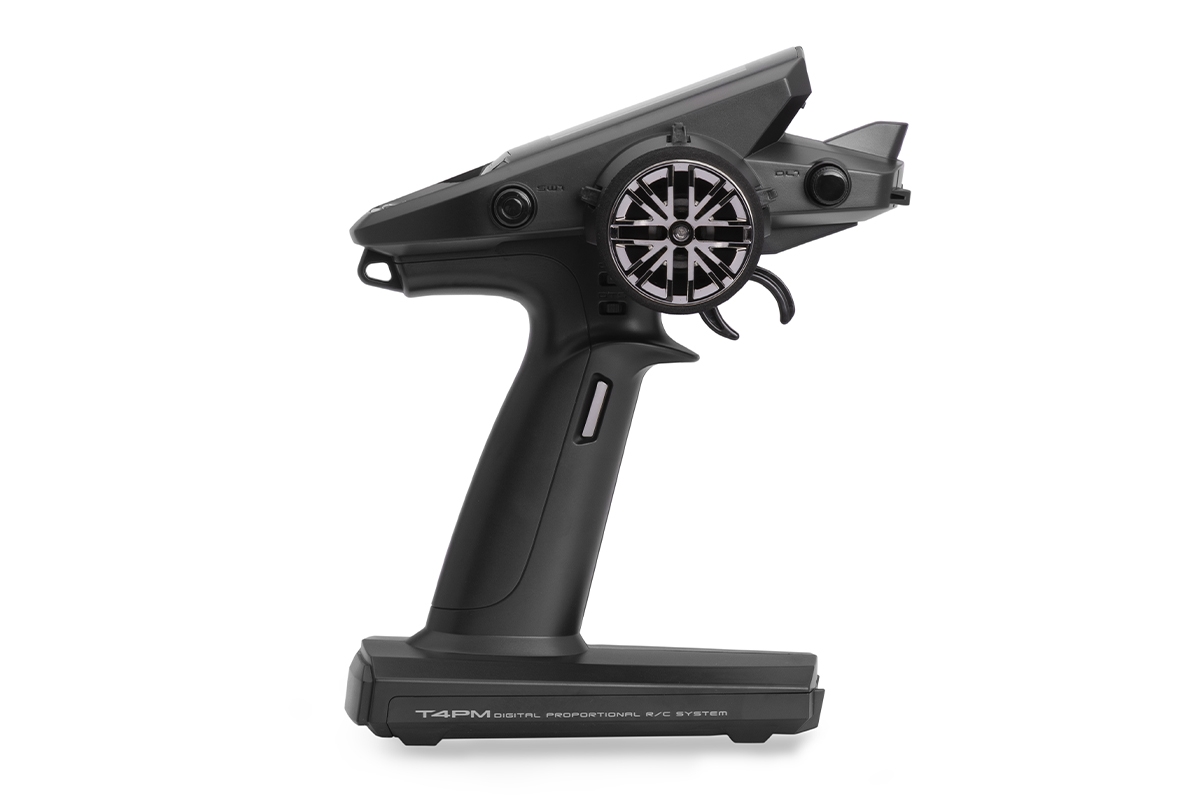 Vysielač T4PM v klasickom volantovom dizajne s rukoväťou dokonale padnúcou do ruky je vybavený volantovým ovládačom riadenia, spúšťou pre ovládanie plynu, dvomi tlačidlovými prepínačmi, jedným otočným ovládačom a piatimi digitálnymi trimami (3 okolo volantu, 2 na rukoväti). K programovaniu slúži trojica tlačidiel a multifunkčný joystick; ľahkú orientáciu v intuitívnom menu zaisťuje veľký podsvietený LCD displej. T4PM má pamäť pre 40 modelov a širokú škálu pokročilých programových funkcií pre bežné aj špeciálne modely áut - napr. nezávislé riadenie a pohon (s 2 regulátormi) predných aj zadných kolies pre Crawler, dvojokruhové brzdy pre veľké modely 1:5, gyro pre drifting, ABS, kontrola trakcie, mix pre tanky a pod.