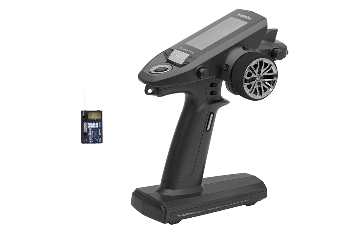 Vysielač T4PM v klasickom volantovom dizajne s rukoväťou dokonale padnúcou do ruky je vybavený volantovým ovládačom riadenia, spúšťou pre ovládanie plynu, dvomi tlačidlovými prepínačmi, jedným otočným ovládačom a piatimi digitálnymi trimami (3 okolo volantu, 2 na rukoväti). K programovaniu slúži trojica tlačidiel a multifunkčný joystick; ľahkú orientáciu v intuitívnom menu zaisťuje veľký podsvietený LCD displej. T4PM má pamäť pre 40 modelov a širokú škálu pokročilých programových funkcií pre bežné aj špeciálne modely áut - napr. nezávislé riadenie a pohon (s 2 regulátormi) predných aj zadných kolies pre Crawler, dvojokruhové brzdy pre veľké modely 1:5, gyro pre drifting, ABS, kontrola trakcie, mix pre tanky a pod.