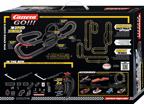 Autodráha Carrera GO!!! dlhá 8,9 m s autami GT3 Audi R8 LMS a Lamborghini Huracán, obsahuje looping, klopenú zákrutu, kolmú stenu, rovinky, zákruty, diel s počítadlom kolies a ďalšie diely. Môžete si zostaviť ďalšie rôzne trate podľa svojej fantázie. Jedná sa o najdlhší set GO!!!