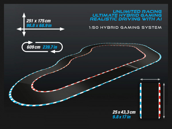 Autodráha Carrera Hybrid dlhá 6,09 m s autami Porsche 911. Pretekať môže až 16 áut naraz, ovládanie pomocou aplikácie, nastavenie áut pomocou AI. Jazdiť a predbiehať sa dá ako na dráhe. tak aj mimo nej.