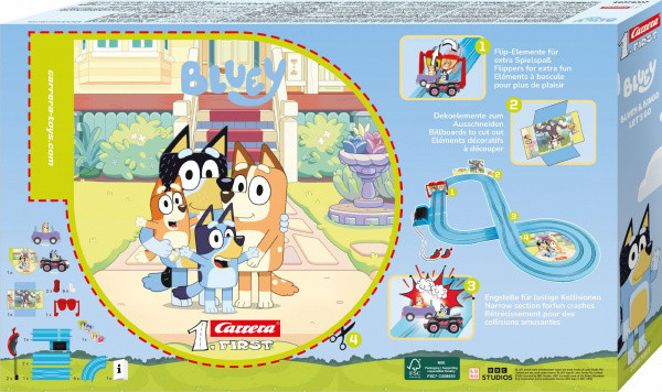 Autodráha Carrera 1. First dlhá 2,9 m s autami Bluey a Bingo. Autodráha, ktorá je vhodná pre deti od 3 rokov, obsahuje rovinky, zákruty, bránu pre väčšiu zábavu pri jazde, ovládače a dekorácie s tématikou Bluey a Bingo. Autodráha sa napája prostredníctvom 4 malých monočlánkov typu C.