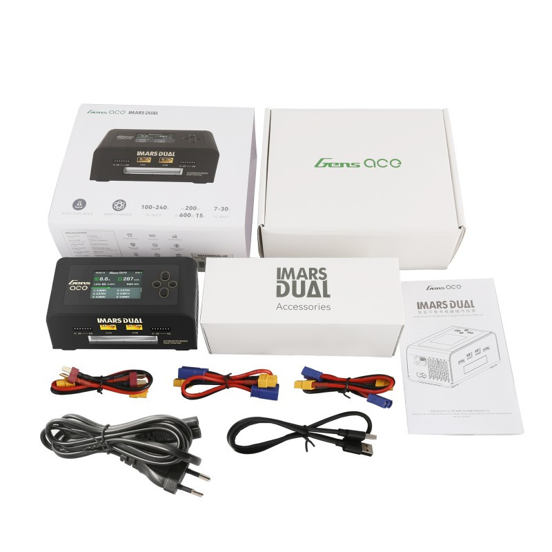 Dvojkanálový digitálny nabíjač/vybíjač GensAce Imars Dual AC200W/DC300W s integrovaným balancérom je nenáročný na ovládanie a podporuje akumulátory typu 1–6S LiPo/LiHV/LiFe alebo 1–16 čl. NiMH. Umožňuje bezpečné a efektívne nabíjanie/vybíjanie vašich akumulátorov a zároveň dokáže eliminovať škody spôsobené nesprávnym nastavením alebo chybou používateľa.
