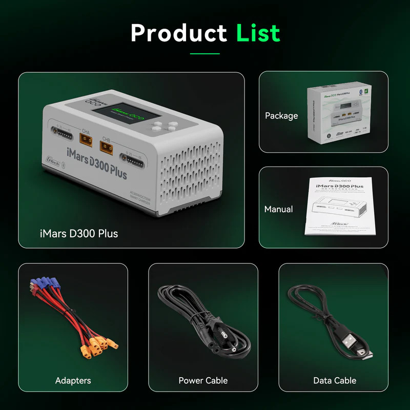 GensAce Imars D300 Plus Dual Channel G/Tech AC/DC 300W/700W je inteligentný dvojkanálový nabíjač/vybíjač, ktorý je primárne navrhnutý pre nabíjanie/vybíjanie a údržbu „chytrých“ akumulátorov Gens Ace G-Tech. Tento nabíjač je však možné používať aj s obyčajnými LiPo, LiHV, LiFe a NiMH akumulátormi.