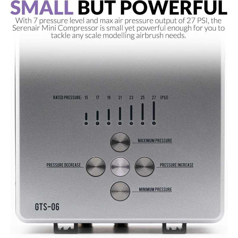 Vďaka až siedmim nastaviteľným úrovniam tlaku a maximálnemu výkonu 27 Psi poskytuje minikompresor GTS-06 Serenair plynulý a rovnomerný prísun stlačeného vzduchu. Či už nanášate jemné tieňovanie, alebo základný náter, tento kompresor zaisťuje optimálnu kontrolu. Možnosť nastavenia tlaku vzduchu umožňuje taktiež pracovať so širokú škálu farieb a techník.
