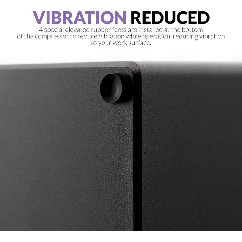 Hluk ďalej znižujú gumové nožičky, ktoré nielenže tlmia vibrácie, ale zaisťujú aj lepšiu stabilitu. Ľahký, tichý a dostatočne výkonný minikompresor Gaahleri Ambition Series GTS-06 Serenair ponúka vynikajúci pomer ceny a výkonu, čo z neho robí vynikajúcu voľbu pre tých, ktorí hľadajú kvalitný, ale cenovo dostupný kompresor pre airbrush.