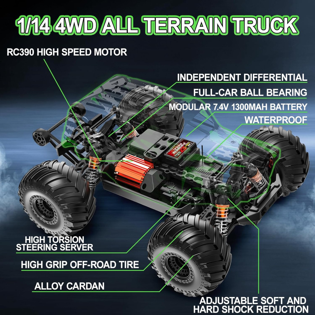 Úplne dokončený model auta kategórie monster truck v mierke 1:14 na diaľkové ovládanie s pohonom všetkých kolies 4WD a maximálnou rýchlosťou až 40 km/h. Súčasťou balenia sú pištoľový vysielač 2,4 GHz, modulárny pohonný akumulátor Li-Ion 7,4 V 1300 mAh a USB nabíjač.