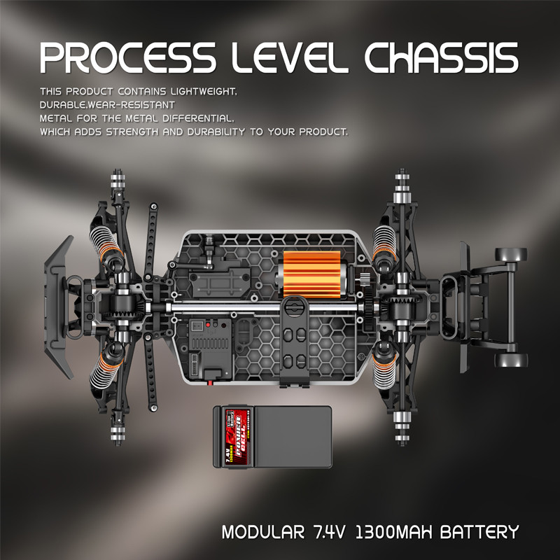 Robustné šasi s voštinovou výstužou podlahy je osadené guličkovými ložiskami, samozrejmosťou je potom nezávislé zavesenie všetkých kolies s CVD poloosami, predný a zadný planétový diferenciál s kovovými prevodmi, prakticky bezúdržbové trecie tlmiče, kovové stredové hnacie hriadeľ. Maximálna rýchlosť modelu, ktorú je možné elektronicky obmedziť, je 40 km/h.