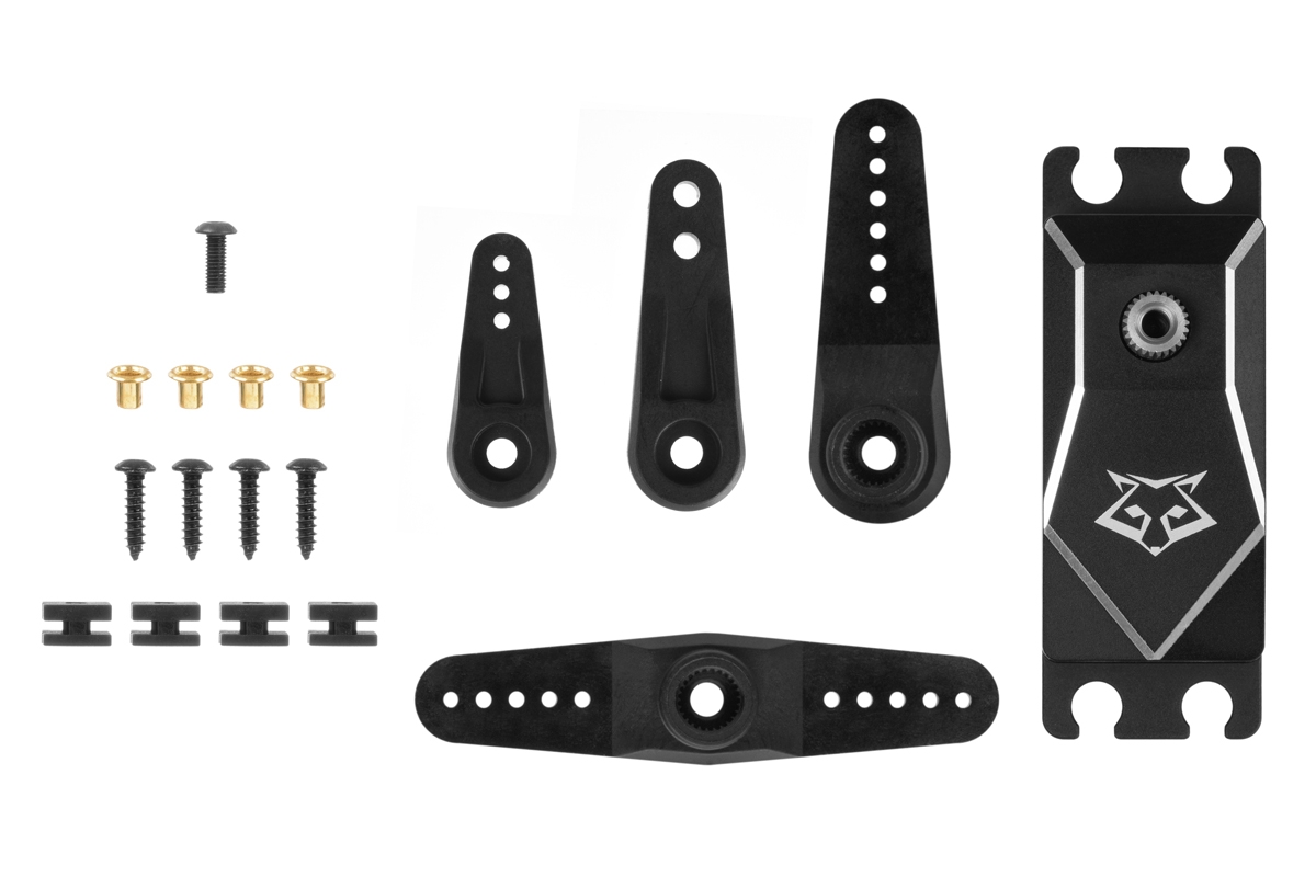 Veľmi silné a rýchle úzkopásmové programovateľné digitálne vysokonapäťové štandardné veľkosti. Titánové/oceľové prevody, vysoké napájacie napätie 10,0–14,4 V (3S LiPo), 3× guličkové ložisko a hliníková krabička pre dokonalé chladenie pri vysokom zaťažení. Nastavenie neutrálu 1520/760 µs (obnovovacia frekvencia 666/333 Hz). Na použitie ako chvostové servo pre RC vrtuľníky 500–800 s pokročilými gyro/flybarles riadiacimi systémami. Ťah: 13/15/18/20 kg.cm pri 10,0/11,1/12,0/12,6 V, rýchlosť: 0,056/0,05/0,043/0,039 s/60° pri 10,0/11,1/12,0/12,6 V. Napájací 40×20×38,8 mm, hmotnosť: 82,5 g.
