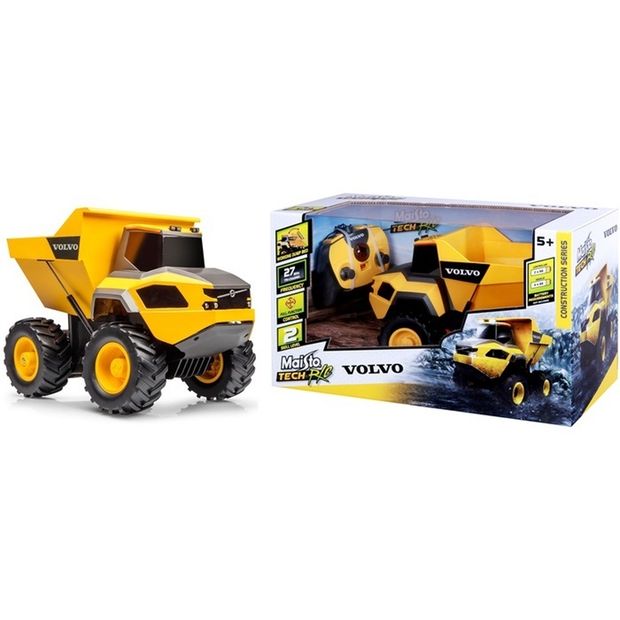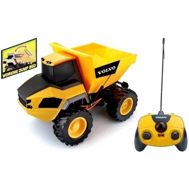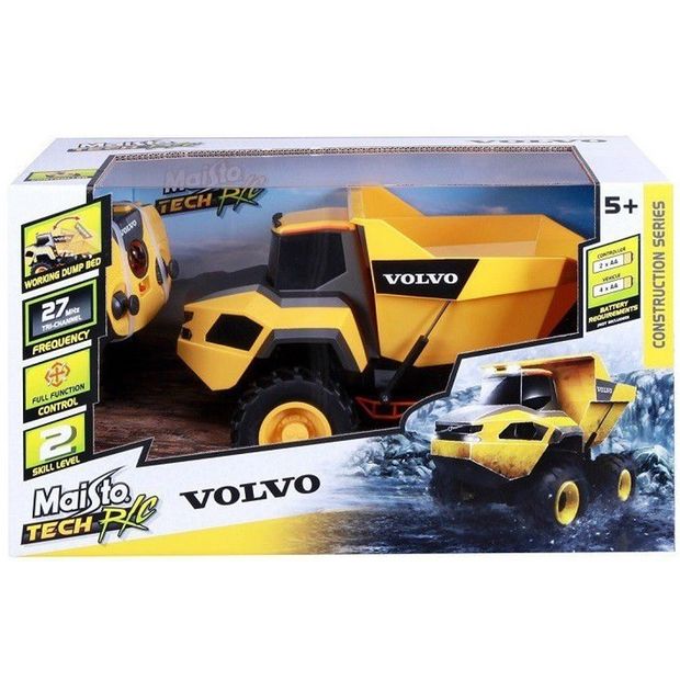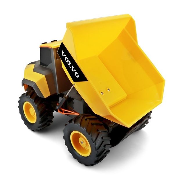Diaľkovo ovládaný banský sklápač Volvo jazdí vpred/vzad, zatáča vpravo/vľavo a má funkčné sklápanie korby. Vďaka veľkým pneumatikám, ktoré sú vybavené terénnym vzorom, a funkčnému odpruženiu si ľahko poradí aj s náročným terénom. Model je dodávaný vrátane trojkanálového vysielača 27MHz.