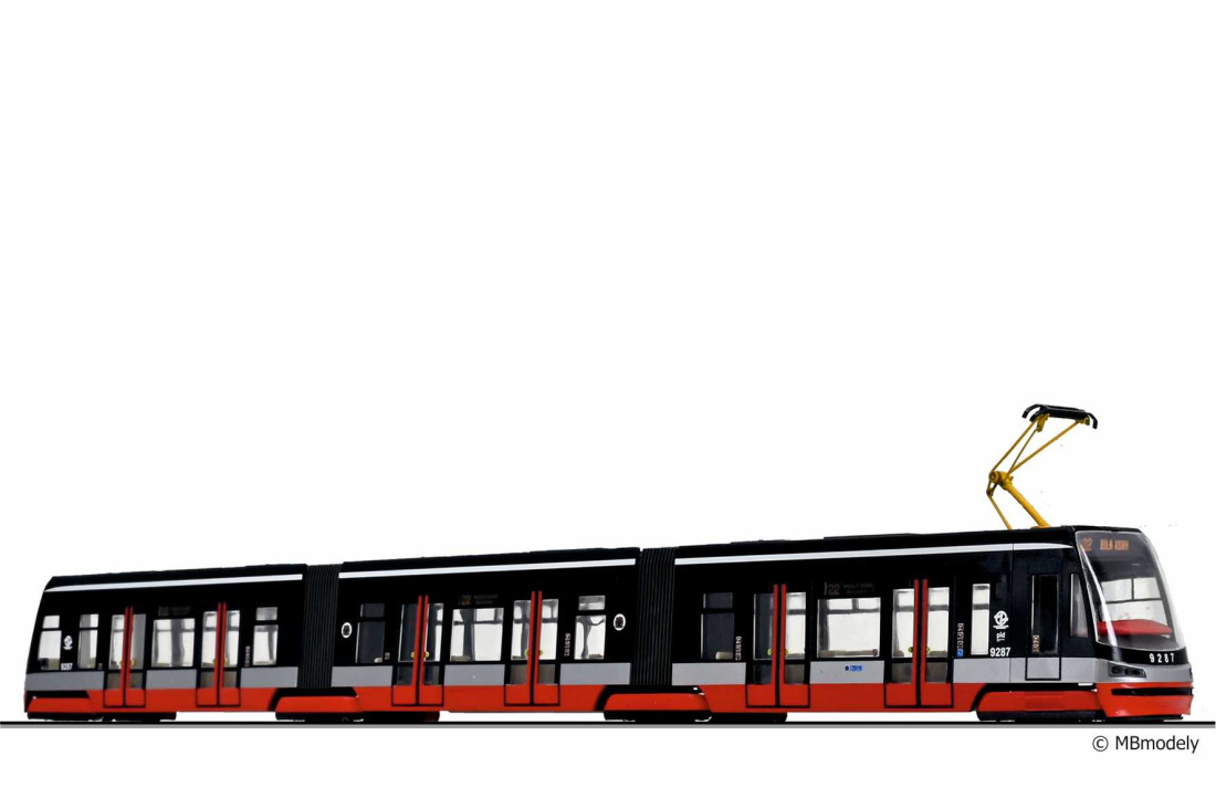 Úplne dokončený plastikový model nízkopodlažnej električky T15 Epocha VI. vo farbách pražských dopravných podnikov.