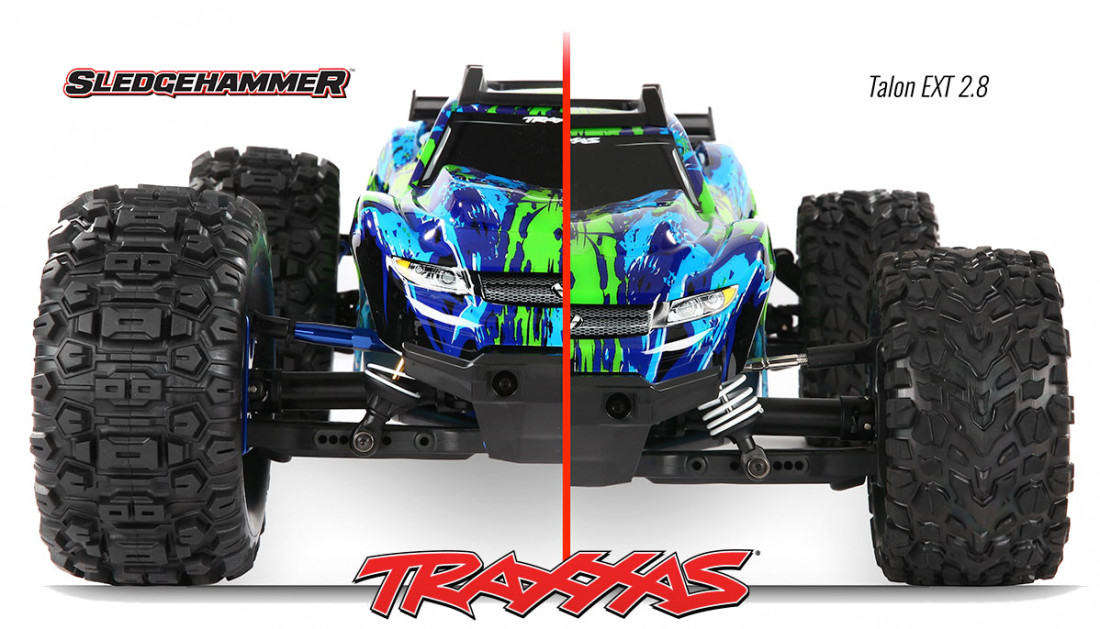Traxxas koleso 2.8" s pneu Sledgehammer a čiernym diskom. Pneumatiky sú nalepené a obsahujú penovú vložku. Kolesá sú určené pre Traxxas Rustler 4×4, poskytujú extrémnu trakciu a výbornú kontrolu nad modelom v každom teréne. Väčší priemer pneumatík Sledgehammer zvyšuje svetlú výšku modelu pre lepšiu priechodnosť terénom.