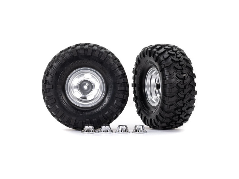 Kompletné univerzálne kolesá. Polomatne chrómované disky s pneumatikami Canyon Trail pre modely TRX-4/6 (2 ks v balení). Rozmer disku ø2.2". Celkový rozmer ø5,3". Unášač je šesťhran 12 mm. Určené pre modely s hriadeľom TRA8255A.