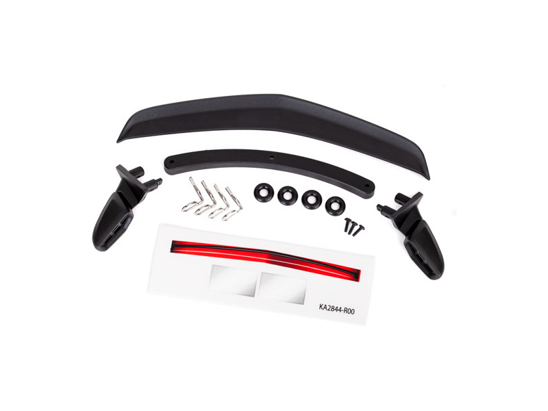 Traxxas maketové doplnky. Sada obsahuje postranné zrkadlá, spojler, držiak spojlera, sponky, o krúžky a samolepky.
