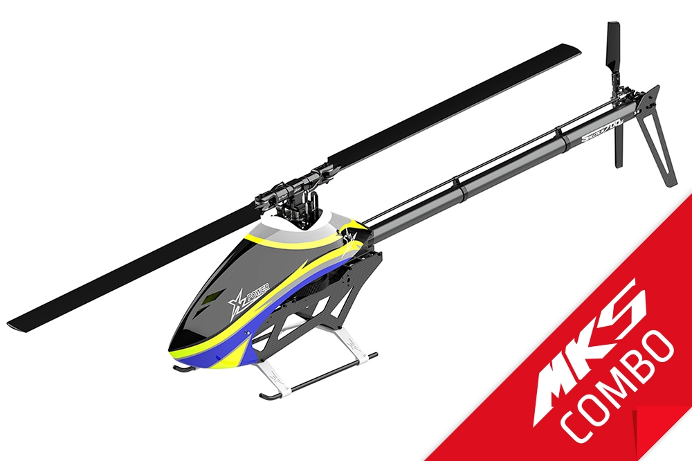 Balení obsahuje kompletní díly mechaniky, motor SunnySky M4526R-540, serva cykliky MKS HBL850, servo vrtulky MKS HBL880, listy hlavního rotoru AzurePower 700 a listy vyrovnávacího rotoru AzurePower 115.